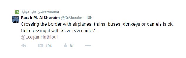 The French literature graduate started her journey from the United Arab Emirates, where she holds a driving licence and where it is legal for women to drive, and tried to cross its border into Saudi Arabia yesterday.