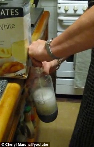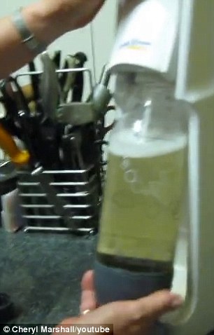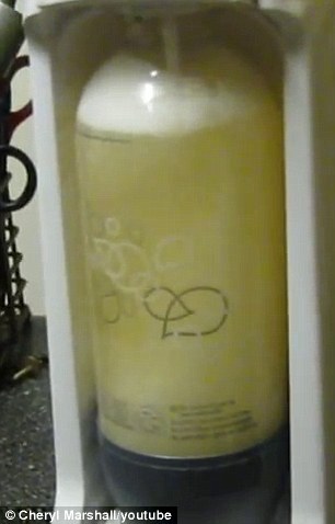 The woman, believed to be Cheryl Marshall from Perth, can be seen threading the bottle onto the machine and with a push of the button, the wine compresses into fizzy 'champagne' within seconds.